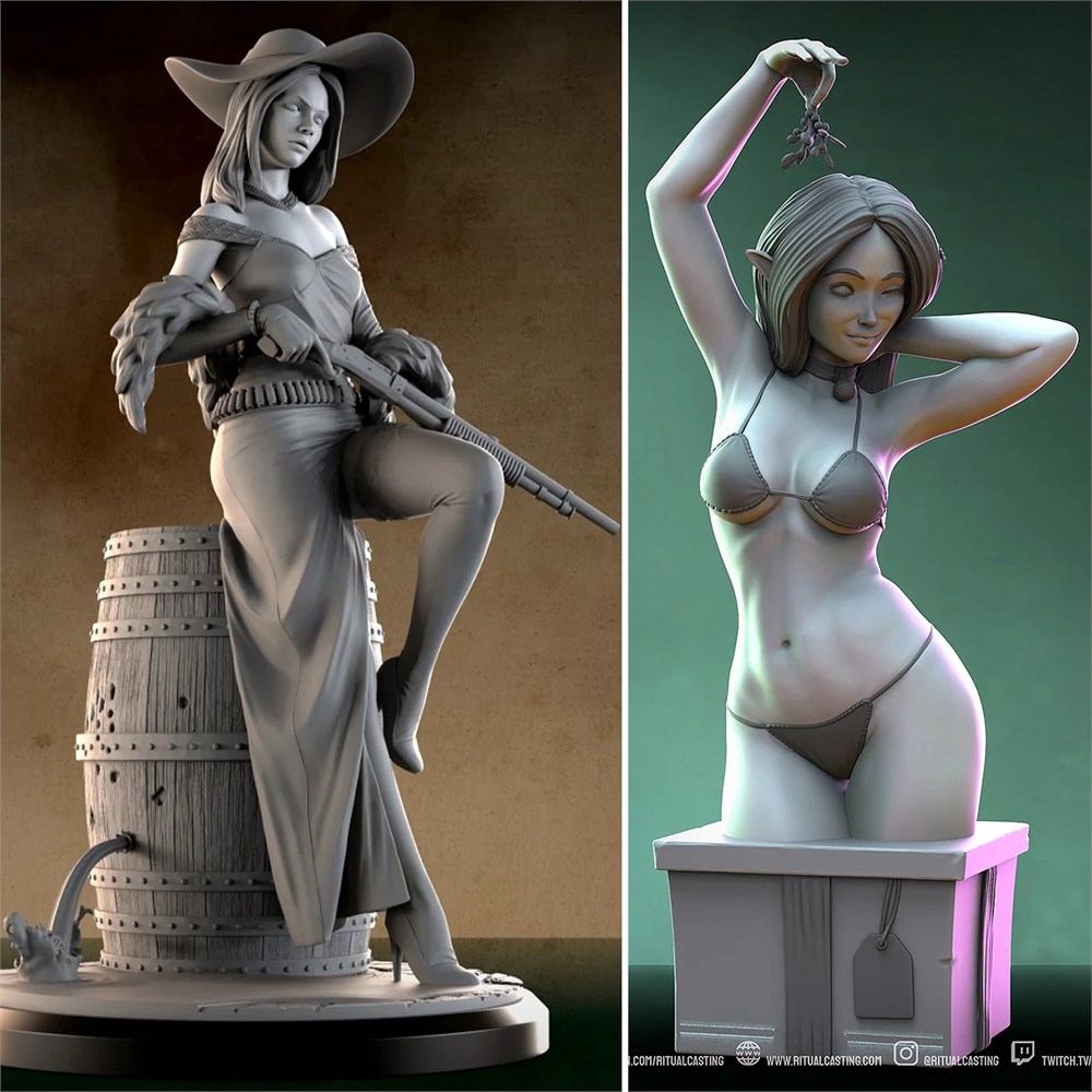 Eva and Cheri. Великолепные фигурки Евы и Черри в стиле фэнтези. Ориентировочная высота фигурки Евы - 180 мм, фигурки Черри - 133 мм, бюста Евы - 160 мм. Фигурка Евы включает в себя два варианта оружия в руках и две головы - с волосами и без. Бюст включает два варианта основания. Фигурки состоят из отдельных частей, предназначенных для самостоятельной сборки и покраски. Клей и краски в комплект не входят. Комплектация и внешний вид модели могут быть незначительно изменены производителем без специального уведомления.